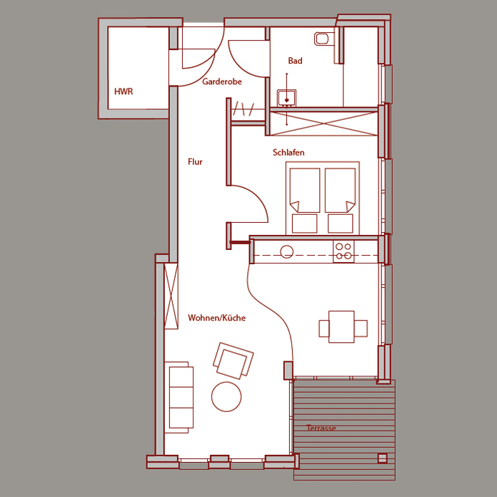 Wohnfläche: 66,21 m2 Wohnen/Küche: 27,97 m2 Garderobe: 5,94 m2 Flur: 4,51 m2 Bad: 6,12 m2 Schlafen: 12,99 m2 HWR: 4,69 m2 Terrasse: 3,99 m2